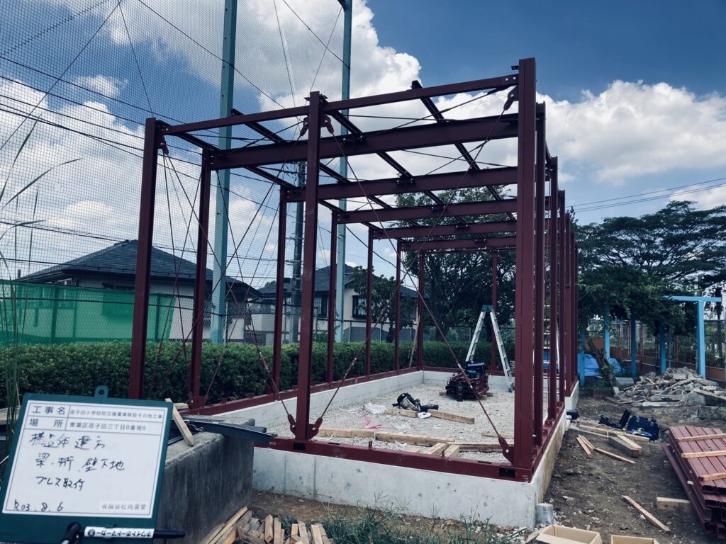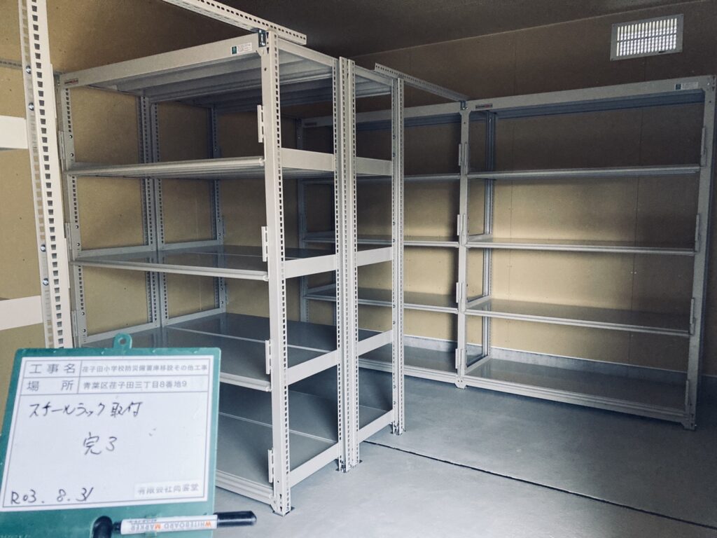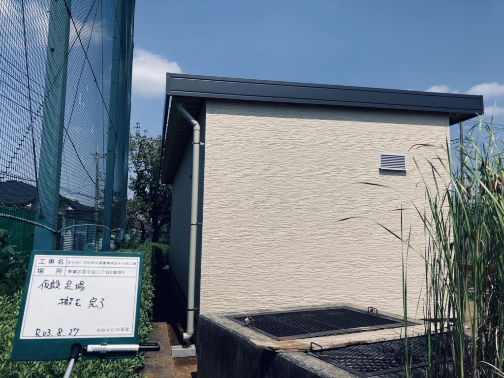 校庭に軽量S造で防災備蓄を新築しました。