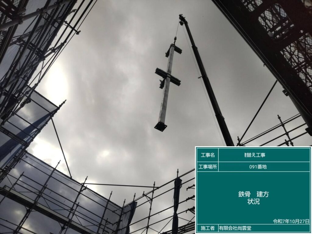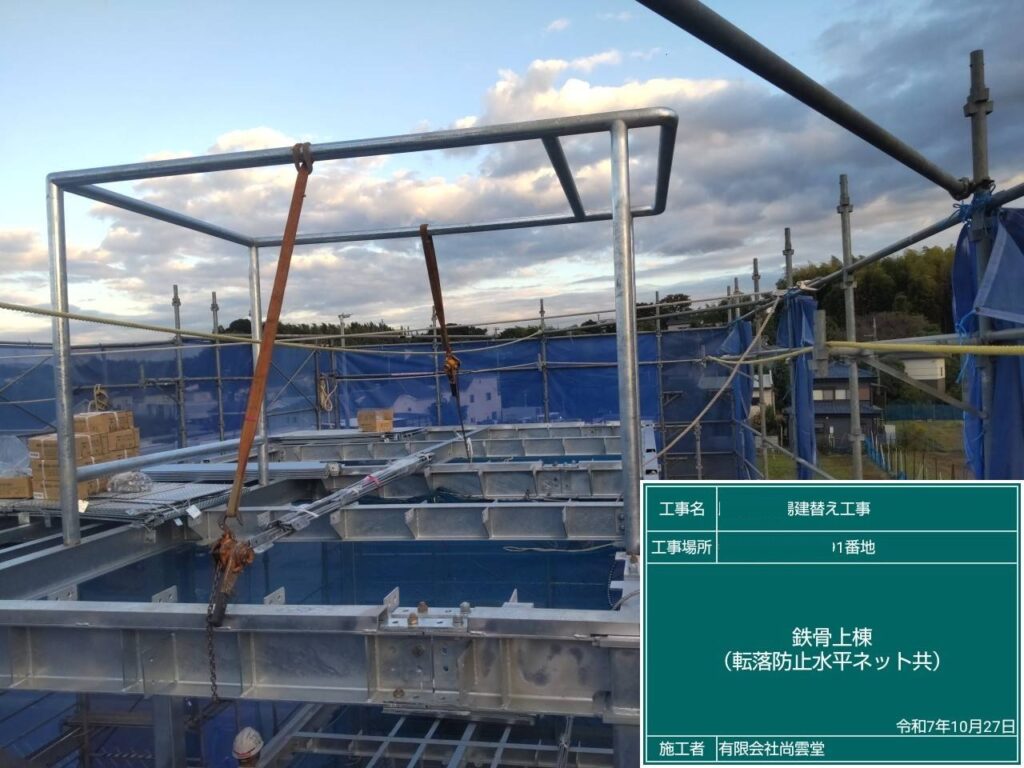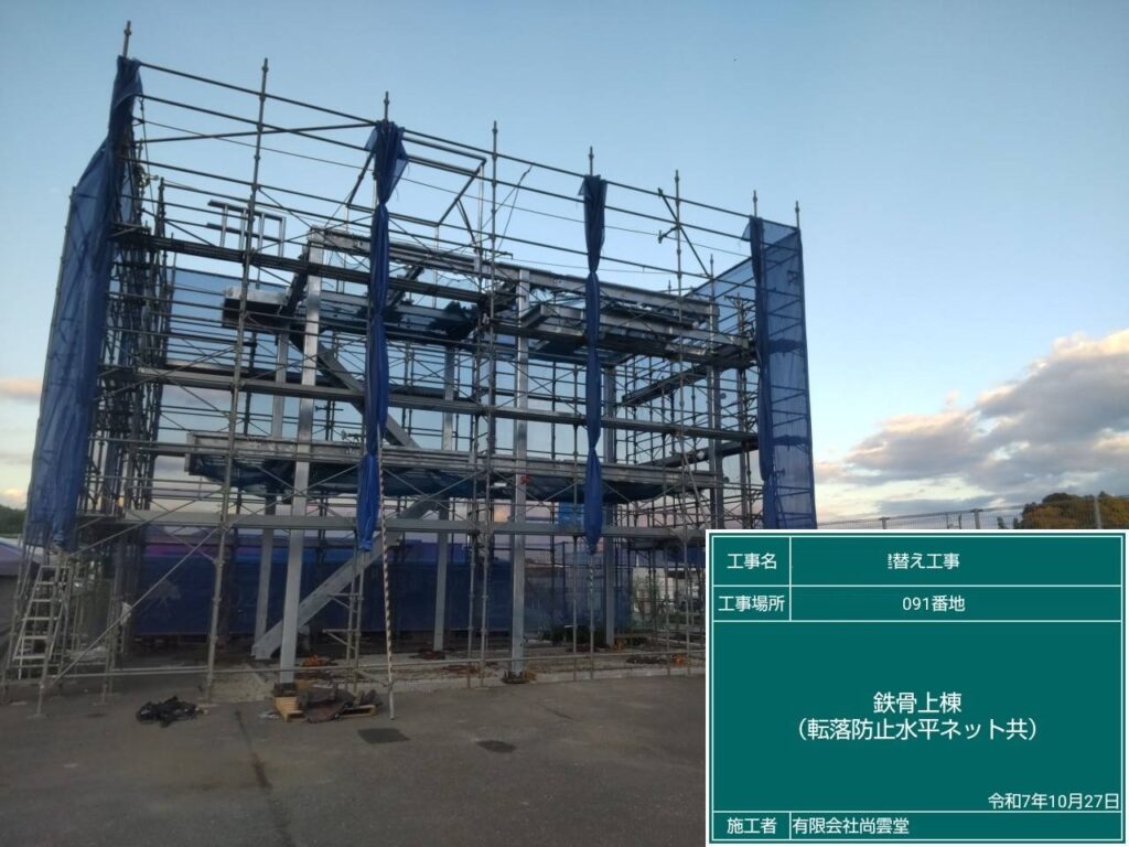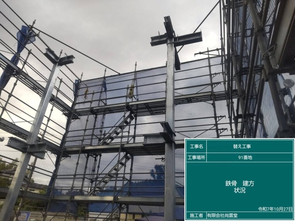 場外検査が合格し現場での、鉄骨建て方を行いました。