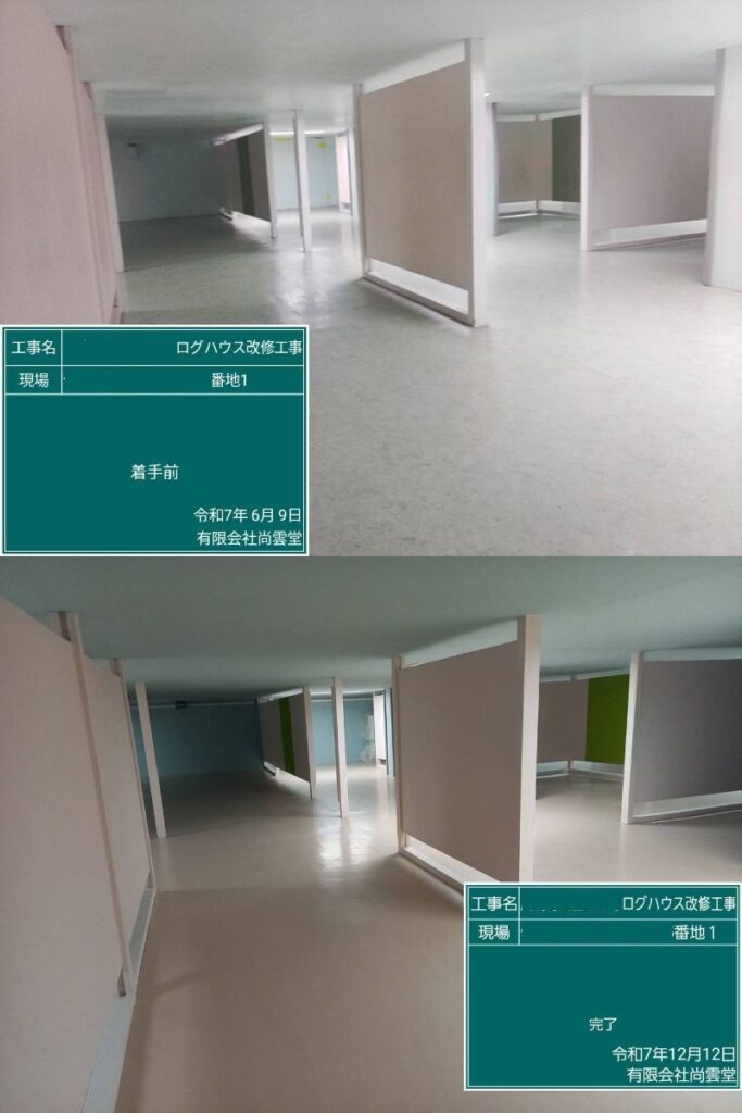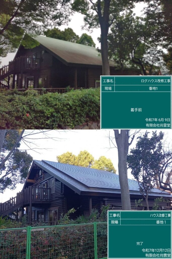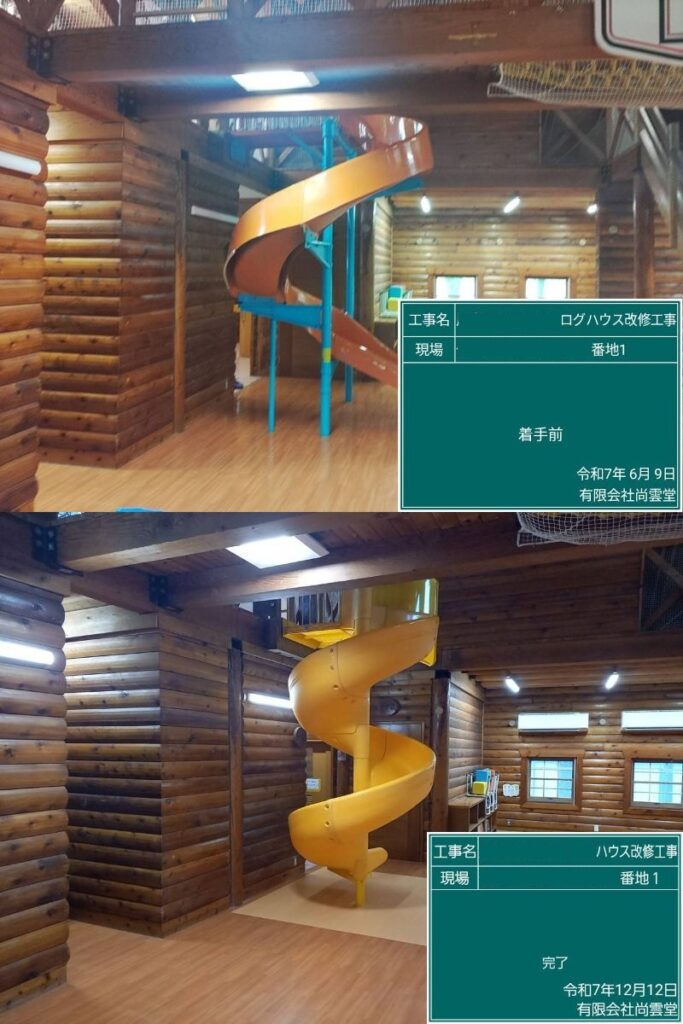 令和7年5月よりこどもログハウス改修工事を行っております。屋根葺き替え、内外木部ほど塗料塗り、木部亀裂部補修、内装改修、設備系の改修を行っております。 役所の担当検査も終わり残すは引き渡し検査のみとなります。 ※引渡し前につき黒板の件名住所は加工してあります